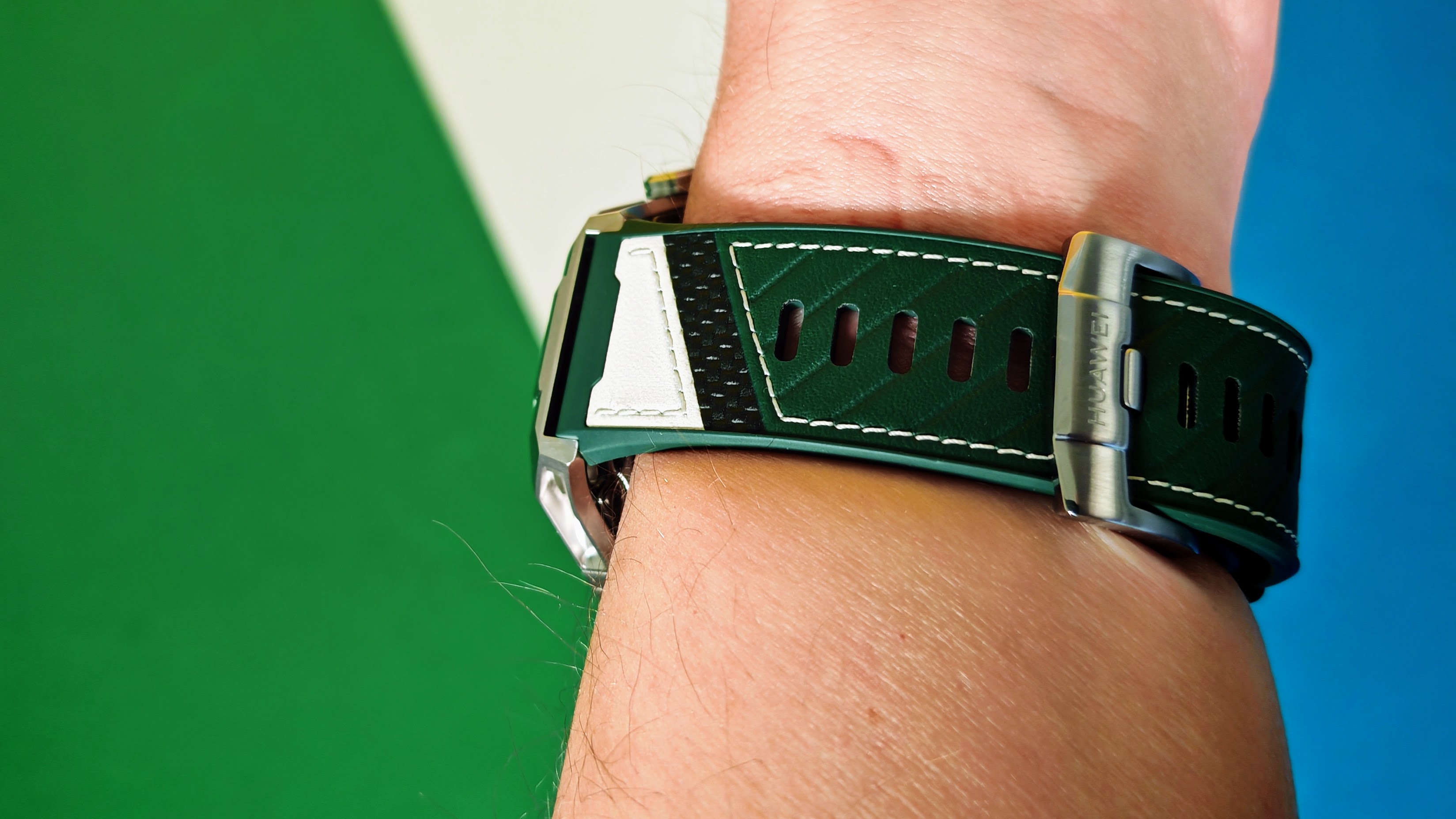 Huawei bietet die Uhr in drei Varianten an: eine nüchtern wirkende Dunkelgrau-Schwarz-Kombination, eine auffällige zweifarbige Version in Blau-Weiß sowie die neue Ausführung in Grün-Weiß. Letztere kombinieren ein Fluorelastomer-Armband mit eingelegten keramischen Elementen. Für alle Modelle sind zudem Edelstahl- oder Titanarmbänder erhältlich, der Wechsel erfolgt schnell und werkzeuglos.