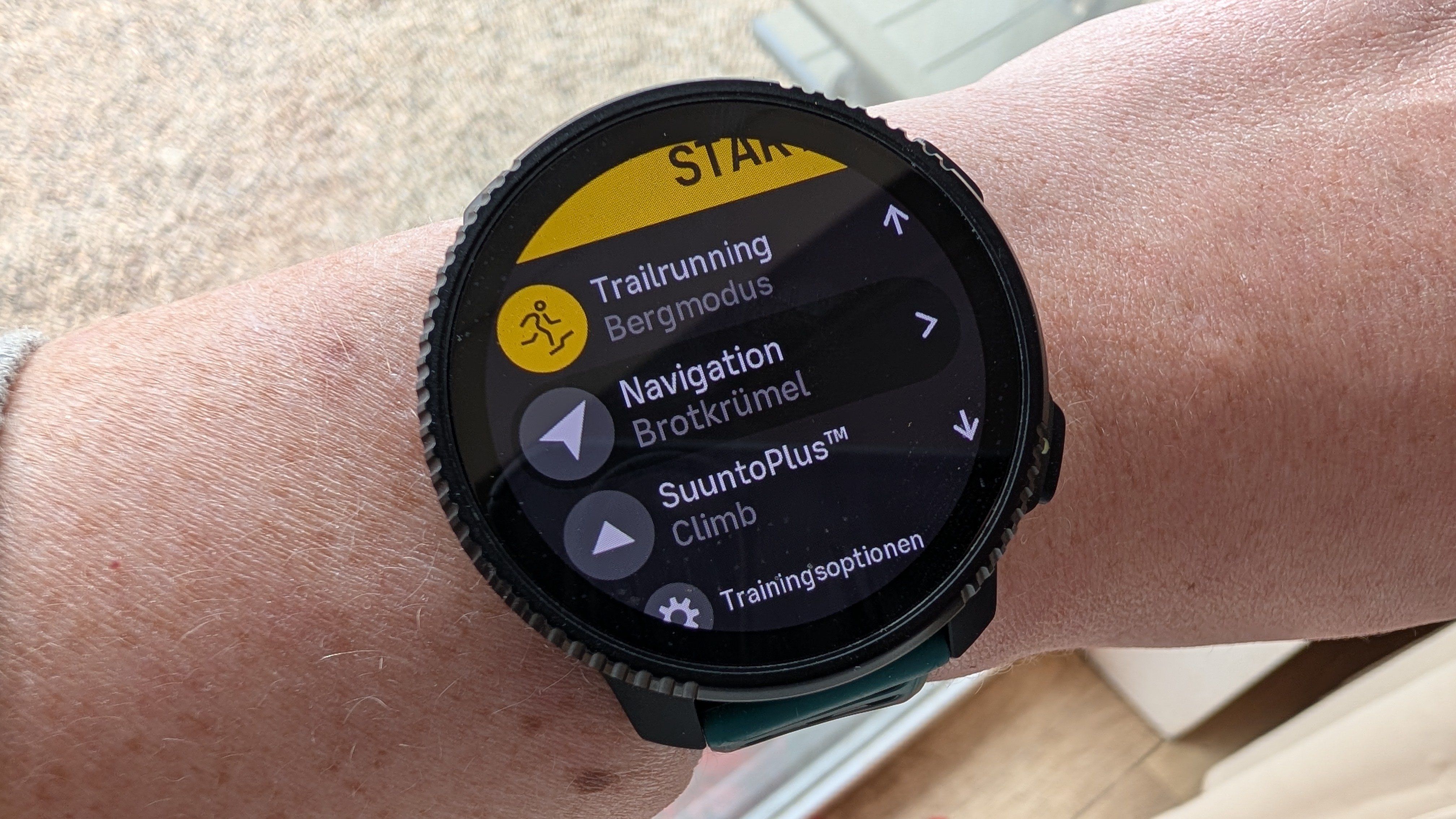 Dieser Fehler tritt übrigens auch auf, wenn man die Tastensperre im normalen Smartwatch–Gebrauch aktiviert hat: Denn erhalten wir eine Benachrichtigung, wird das Display automatisch entsperrt. Knickt man dann das Handgelenk ab, springt die Uhr ins Traingsmenü und aktiviert unter Umständen automatisch die Aufzeichnung einer Trainingseinheit, obwohl wir das gar nicht wollen. In unserem Test trat dieses Problem mehrmals täglich auf. Der Grund dafür liegt in dem wuchtigen Gehäuse der Uhr und der Position der Drehkrone. Bereits ein Abknicken des Handgelenks im 45-Grad-Winkel reichte, um die Krone zu aktivieren. Zwar könnte man die Uhr weiter oben am Unterarm positionieren, wäre dann aber für eine brauchbare Pulsmessung definitiv auf einen Brustgurt angewiesen.