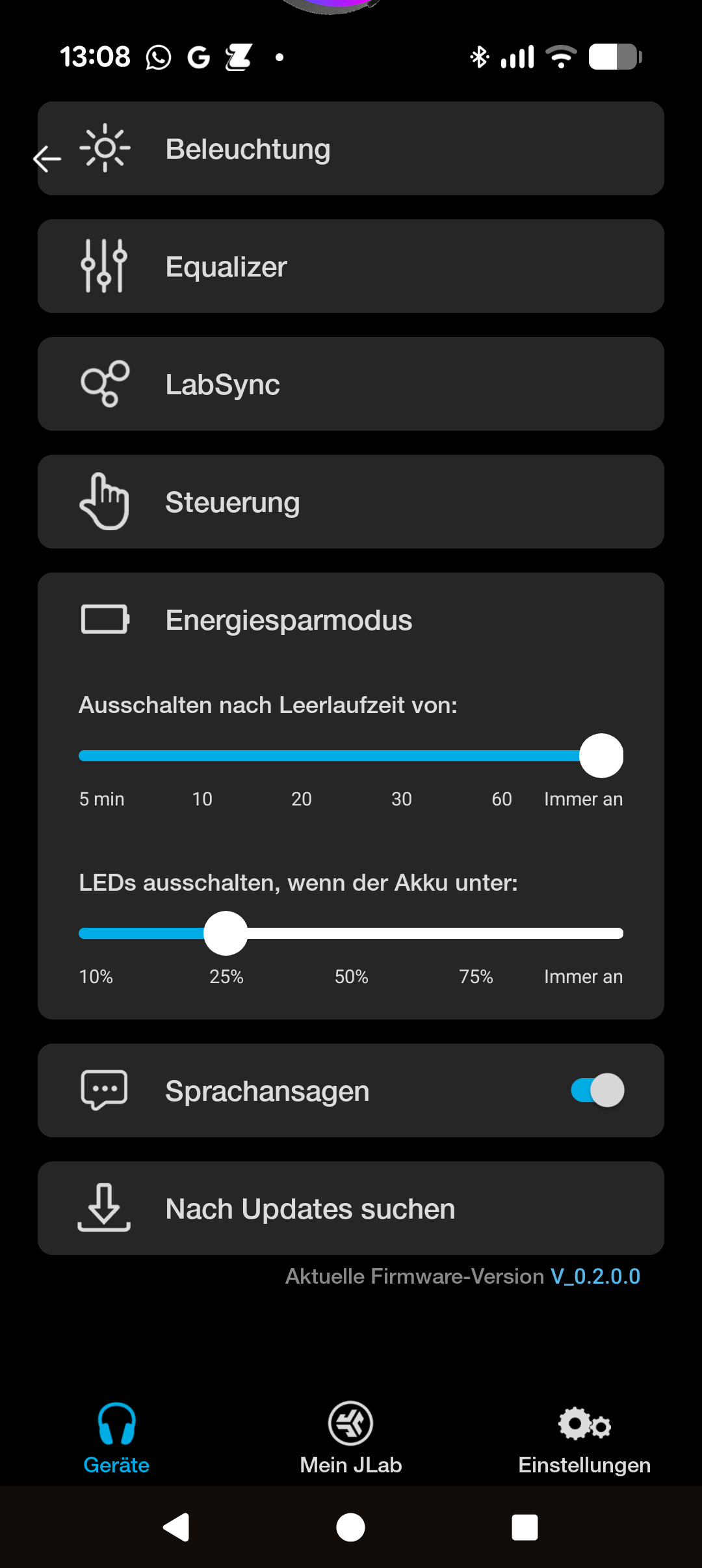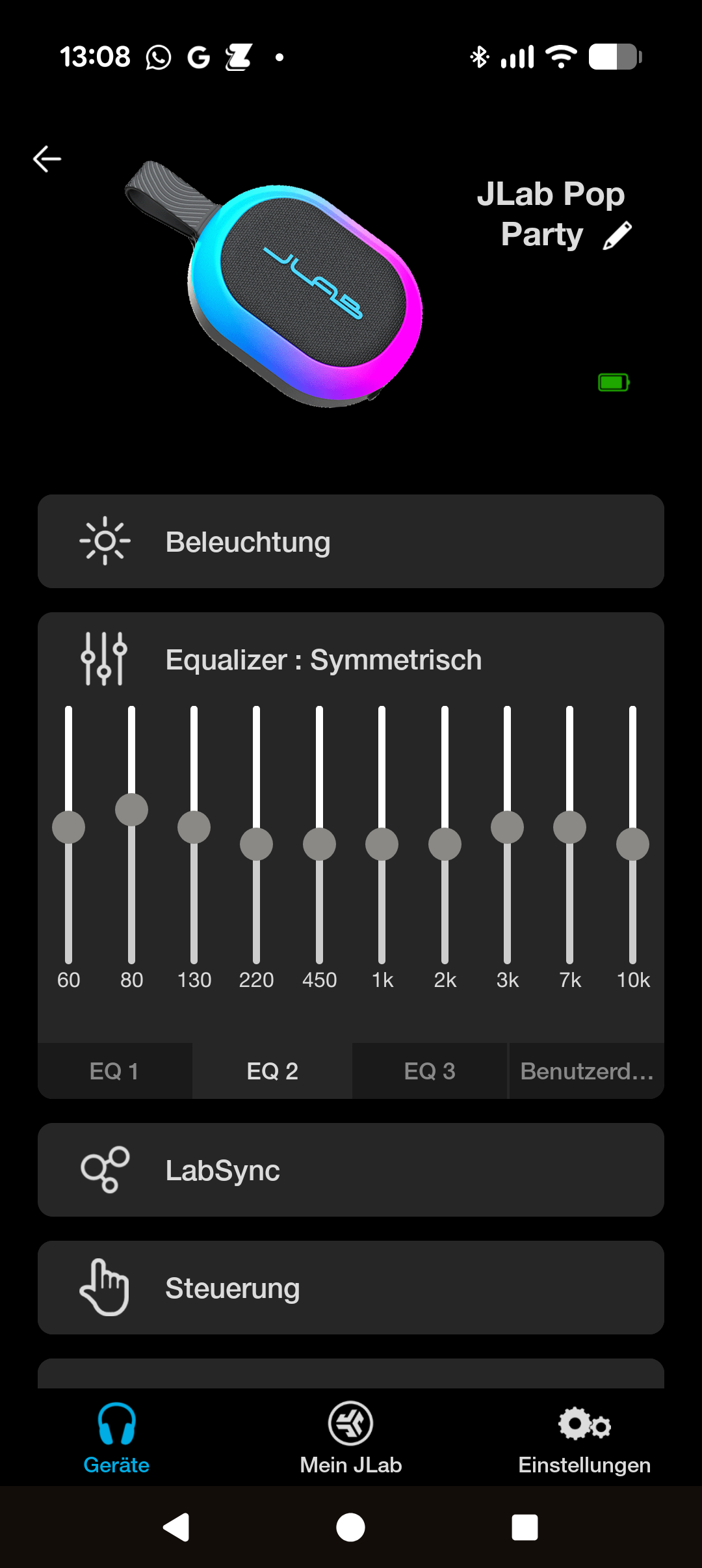 Die JBL Portable App lässt sich selbsterklärend bedienen. Neben dem aktuellen Akkustand informiert sie über Firmware-Updates und bietet einen 5-Band-Equalizer mit vier Voreinstellungen. Die Auswirkungen auf den Klang fallen allerdings überschaubar aus.