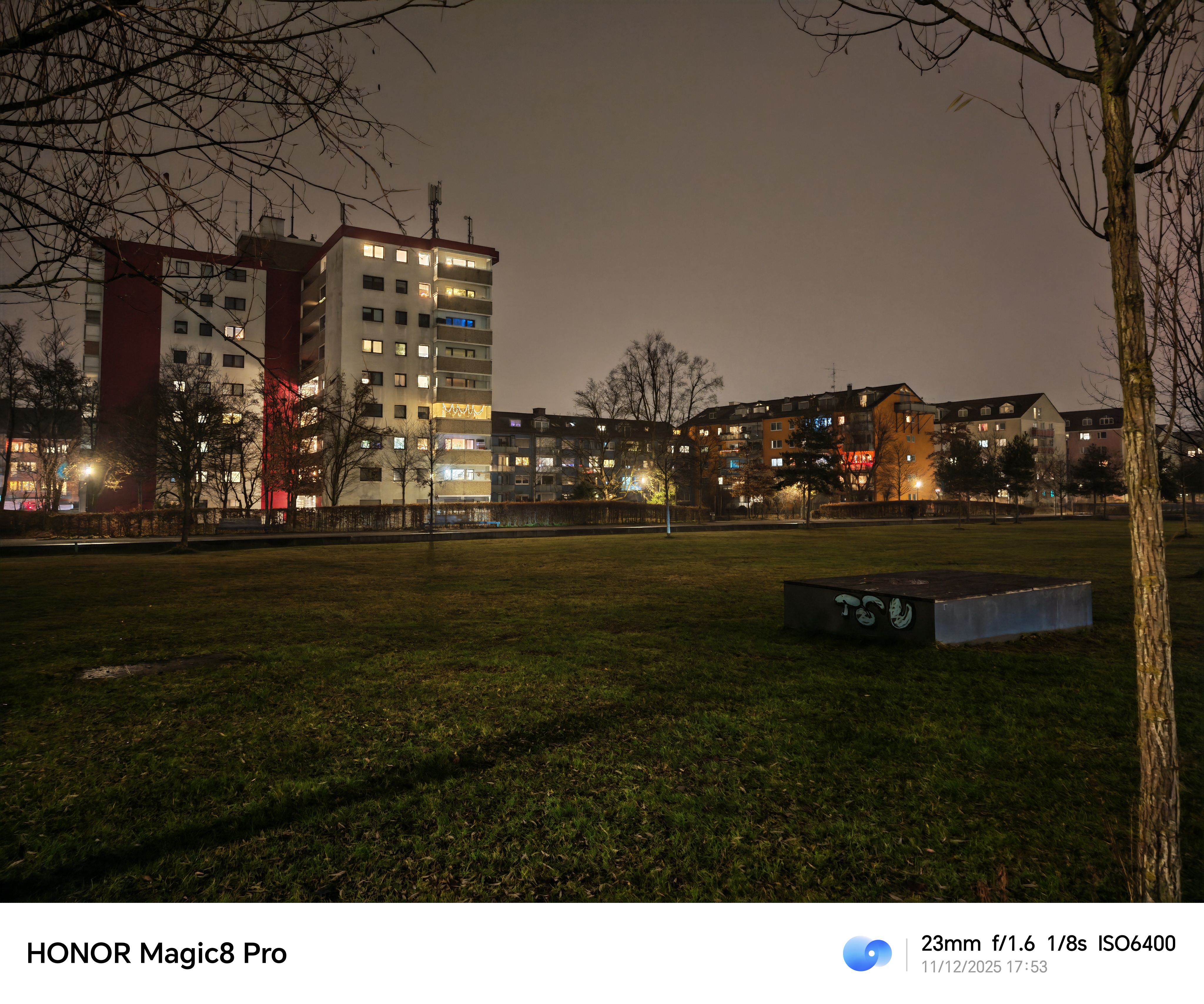 Auch bei Nacht überzeugt die Kamera mit einer effektiven Aufhellung der Aufnahmen. Lediglich das Ultraweitwinkelobjektiv fällt mangels optischer Bildstabilisierung etwas ab und liefert weniger scharfe Ergebnisse. Leichtes Bildrauschen bei höheren Zoomstufen lässt sich nicht vollständig vermeiden, insgesamt bleibt die Bildqualität jedoch auf hohem Niveau.