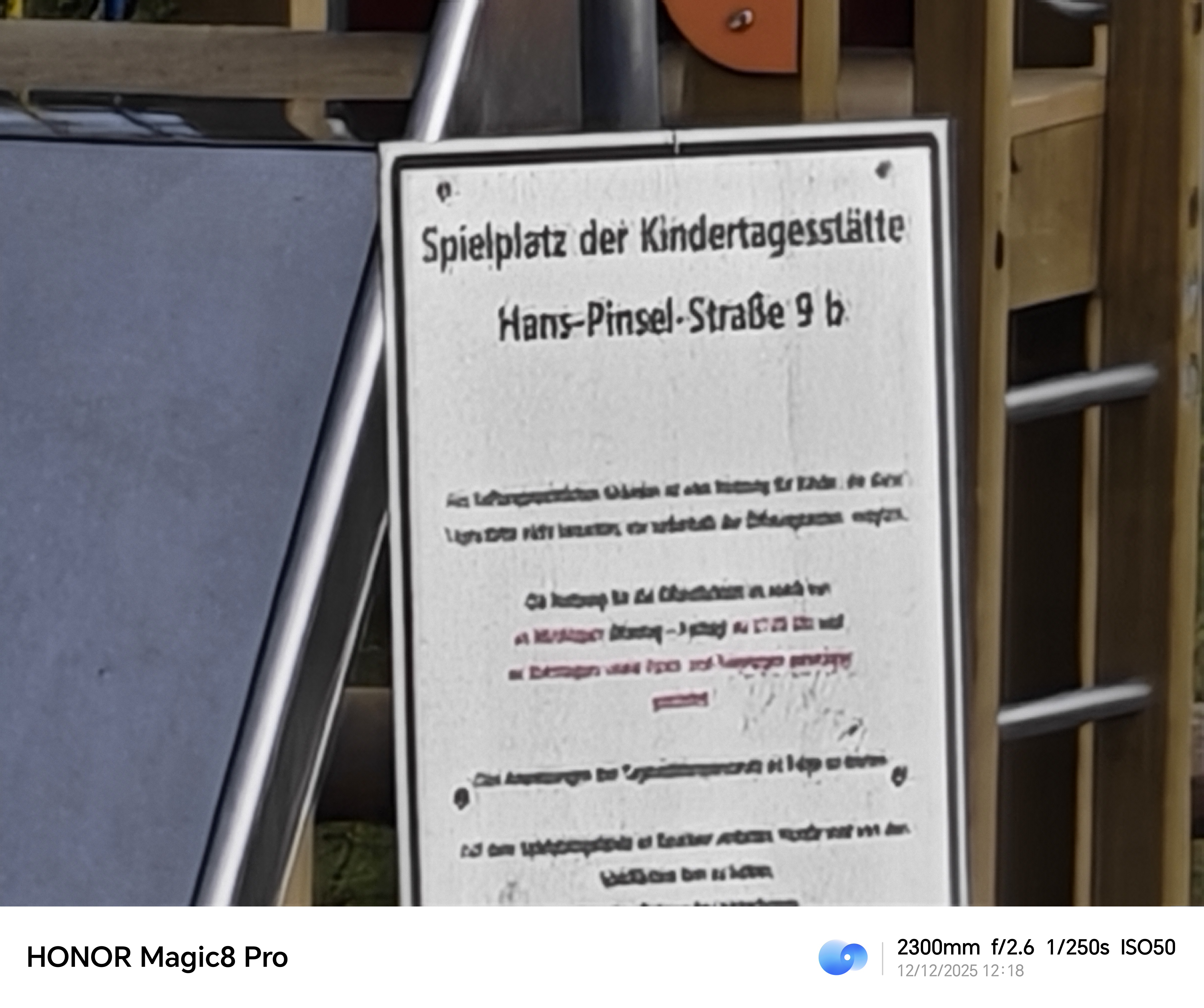 Videos nimmt das Pixel 10 Pro in 8K mit 30 fps oder 4K mit 60 fps auf, HDR funktioniert bis 30 fps. Der Laser-Autofokus arbeitet präzise, die Kamera-App startet aber mitunter leicht verzögert. Night Sight erzeugt mit einer Sekunde Belichtungszeit natürliche Nachtaufnahmen, überbelichtet jedoch bei Straßenlaternen gerne mal. Der 100-fache Zoom wird durch Nachbearbeitung von KI erreicht und beeindruckt, ist aber weit entfernt von Perfektion. So wird Schrift zu Kauderwelsch – verständlich, wenn der KI schlicht zu wenig sinnvolle Bildinformation vorliegt. An Menschen traut sich die KI gleich gar nicht heran. Das sieht zuweilen ulkig aus, wenn die Umgebung knackscharf dargestellt wird und die Menschen unscharf bleiben. Bei Bewegung verliert der Tele-Zoom an Schärfe und erfordert ruhige Hände. Neu ist ein so genannter Kamera-Coach, der Tipps für Motive und Zoom gibt. Er ignoriert aber komplexe Szenen und wiederholt sich häufig.
